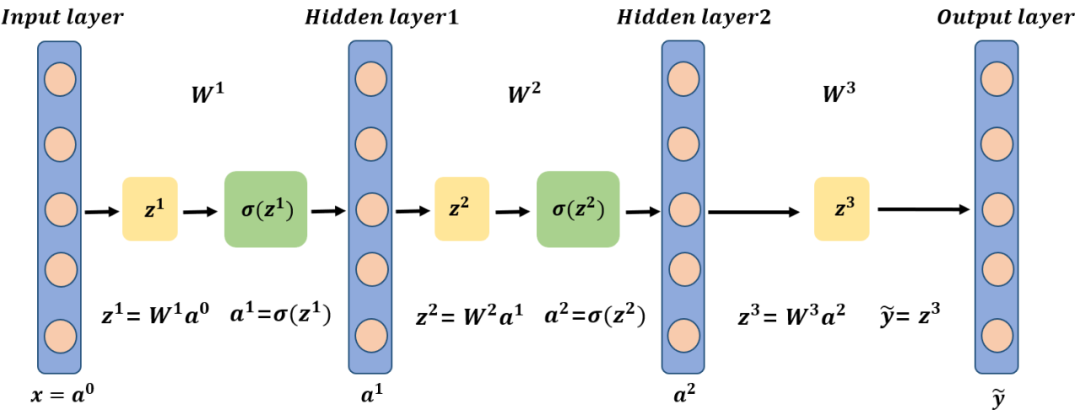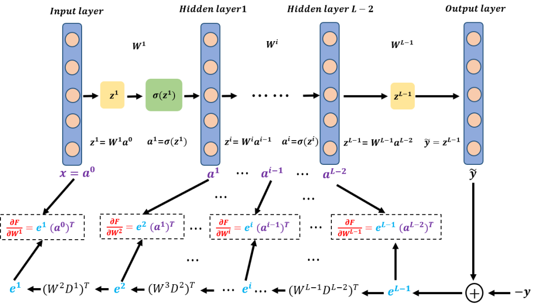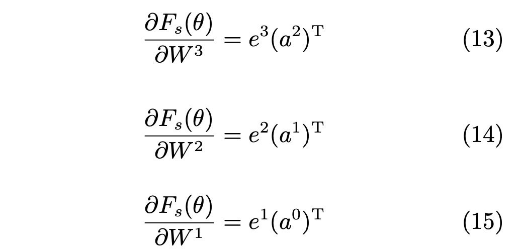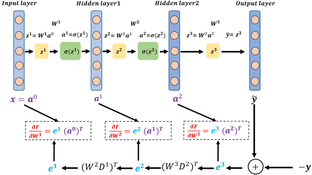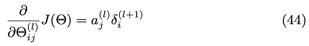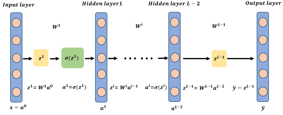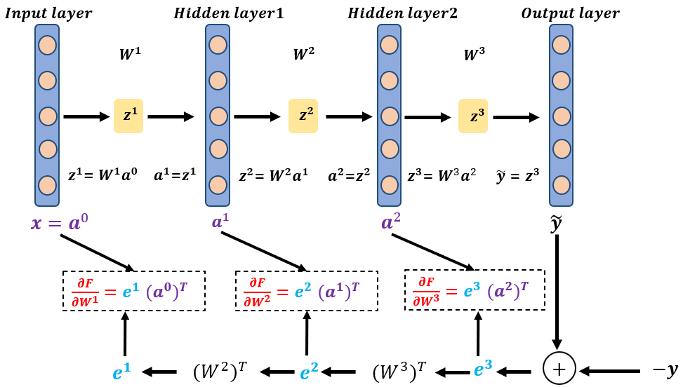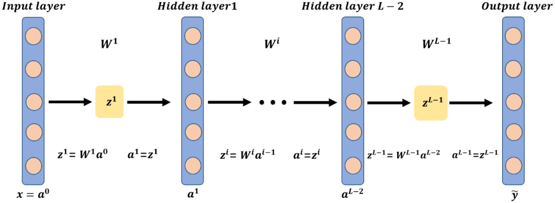 ©PaperWeekly 原创 · 作者|孙裕道 学校|北京邮电大学博士生 研究方向|GAN图像生成、情绪对抗样本生成 背景介绍 BP(反向传播)是有 Geffrey Hinton 在 1988 年发表的论文《Learning representations by back-propagating errors》 中首次被提出来。 该论文从题目到内容到参考文献一共 2 页半,Hinton 也借此工作荣获 2018 年的图领奖。在深度学习领域,BP 的重要程度在怎么强调也不为过,本文会从矩阵的视角对 BP 进行详细推导,为了更好地理解 BP 的工作原理,本文也画了大量的示意图帮助理解。 本文的公式经过自己很多次的推导打磨,尽力做到准确无误,每一张图也是反复的捉摸力求精准表达。本文的阅读难度确实很大,但是因为其重要,我觉得反复抄写下面的推导,也会有很多收获。 引言 在吴恩达的斯坦福机器学习的讲义中关于 BP 原理的介绍只给出了最后的 BP 矩阵的推导结果,略去了中间的推导过程。本文会对略去的推导过程进行补全。为了减少阅读阻碍,BP 矩阵证明过程会从预备知识开始慢慢铺展开来,其中最难啃的部分就是矩阵形式的链式法则。本文文章结构和的各个章节的内容如下: p 3 是一些预备知识介绍了矩阵求导的细节,如果想要看懂之后的 BP 矩阵推导这部分的两个小节一定要看明白 p 4 是关于 4 层无激活函数的 BP 推导细节 p 5 是关于 L 层无激活函数的 BP 推导细节 p 6 是关于 4 层含激活函数的 BP 推导细节 p 7 是关于 L 层含激活函数的 BP 推导细节 p 8 是对吴恩达机器学习讲义中关于 BP 章节结果的验证 预备知识 3.1 推导形式1 已知, 是标量即 , , , , , 表示向量的 2 范数,将矩阵中各个维度带入到公式(1)有如下形式: 令 , 。则对矩阵 的链式法则的求导公式如下所示: 其中 , ,直观可以发现等式(3)左右两边的雅可比矩阵维度一致。对矩阵 的链式法则的求导公式如下所示: 其中 , ,等式(4)左右两边的雅可比矩阵维度一致。 3.2 推导形式2 是激活函数, 是标量即 , , , , , 表示向量的2范数,将矩阵的各个维度带入到公式(5)中有如下形式: 令 , ,, ,则有: 其中,,即 是一个对角矩阵,对角线的元素为激活函数的导数。 和 矩阵的维度一致。 其中, 和 矩阵的维度一致。 4 层无激活函数的神经网络 ▲ 图1:4层无激活函数的前向传播过程 图 1 表示的是 4 层无激活函数神经网络的前向传播过程,其中损失函数如下所示: 令 ,根据 p 3 预备知识的推导形式 1 的公式(3),(4)可求得: 令 , , 。又因为 , , ,将公式(10),(11),(12)整理为如下所示: 根据公式(13),(14),(15)将 4 层无激活函数的 BP 原理可以形象地表示为图 2,其中图中虚线框表示为各个层权重参数的梯度,可以发现各层的权重参数梯度由前一层网络的前馈计算值与后一层网络传播的误差信息整合而来。 ▲ 图2:4层无激活函数的BP原理图 L层无激活函数的神经网络 ▲ 图3:L层无激活函数的前向传播过程 图 3 表示的是 L 层无激活函数神经网络的前向传播过程,其中损失函数如下所示: 令 ,根据 p 3 预备知识的推导形式 1 的公式(3),(4)可求得: 令 , , , 。 又因为 , , , , ,则梯度的通项公式为: 根据公式(20)将 L 层无激活函数的 BP 原理可以形象地表示为图 4 所示: ▲ 图4:L层无激活函数的BP原理图 4层含激活函数的神经网络 ▲ 图5:4层含激活函数的前向传播过程 图 5 表示的是 4 层含激活函数神经网络的前向传播过程,其中损失函数如下所示: 令 ,根据 p 3 预备知识的推导形式 2 的公式(7),(8)可求得: 其中 和 为对角矩阵,令 ,则有 , ;令 , , 。综上所述有: 根据公式(25),(26),(27)将 4 层含激活函数的 BP 原理可以形象地表示为图 6,跟 p 4 中的 4 层无激活函数 BP 原理示意图的差异在于后向传播的误差信息需要多乘一个对角矩阵 。 ▲ 图6:4层含激活函数的BP原理图 L 层含激活函数的神经网络 ▲ 图7:L层含激活函数的前向传播过程 图 7 表示的是 L 层含激活函数神经网络的前向传播过程,其中损失函数如下所示: 令 ,根据 p 3 预备知识的推导形式 2 的公式(7),(8)可求得: 其中, 为对称矩阵。 ,则 , , ; , , , 。综上所述可知梯度的通项公式为: 根据公式(32)将 L 层含激活函数的 BP 原理可以形象地表示为图8所示: ▲ 图8:L层含激活函数的BP原理图 验证BP矩阵推导 本节主要是对吴恩达机器学习讲义中(ML-AndrewNg-Notes: Coursera)关于 BP 原理结论部分的验证,所以本文的主要目的是验证吴中的关于 BP 结论与本文的 p 4 之间的结论是否一致。由于符号和表示形式的差异,将吴中关于 BP 原理部分的描述用蓝色字体表示(该部分在),将验证过程用红色字体表示。 一个 4 层的神经网络,具体示意图如下所示: ▲ 图9:吴恩达机器学习讲义中的网络结构 从最后一层的误差开始计算,误差是激活单元的预测 与实际值 之间的误差。用 来表示误差,则: 利用误差值 来计算前一层的误差: 其中 是 导数, 是经权重 而导致的误差。第二层的误差为: 因为第一层是输入变量,不存在误差,有了所有的误差表达式之后,便可以计算各个层权重的偏导数为: 代表目前所计算的第几层, 代表目前计算层中的激活单元的下标,也是下一层的第 个输入变量的下标。 代表下一层中误差单元的下标,是受到权重矩阵中的第 行影响的下一层中的误差单元的下标。 验证: 吴恩达的这个讲义中关于 BP 推导中只展示出矩阵推导出的结果,略出了中间证明的部分,其中的证明过程可以类比本文中的 p 6 中证明过程,为了能够让验证 BP 推导过程