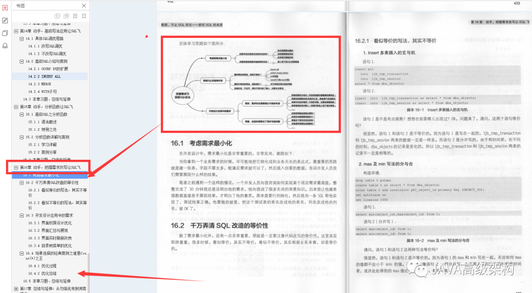 随后本书指引大家学会等价改写、过程包优化、高级SQL、分析函数、需求优化这些相关的五大神功。有点头晕,能否少一点套路?淡定,这还是“术”的范畴,依然是教你如何解决问题,只不过这次是如何改写SQL完成优化。