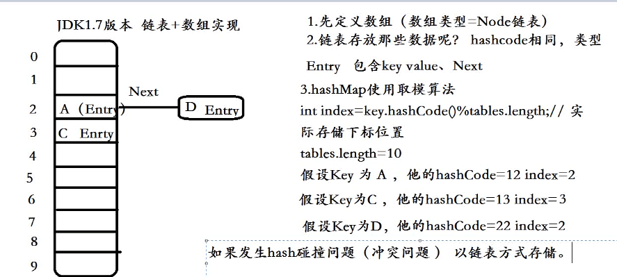 1、jdk1.7 数组加链表 2、链表存放数据:hashcode相同,Entry{key:键 value:值 next:下一个节点} 3、取模算法,计算出存放数组的下标 int index = key.hashCode()%tables.length; 来源:oschina链接:https://my.oschina.net/u/3142419/blog/2120785 标签 JDK Entry