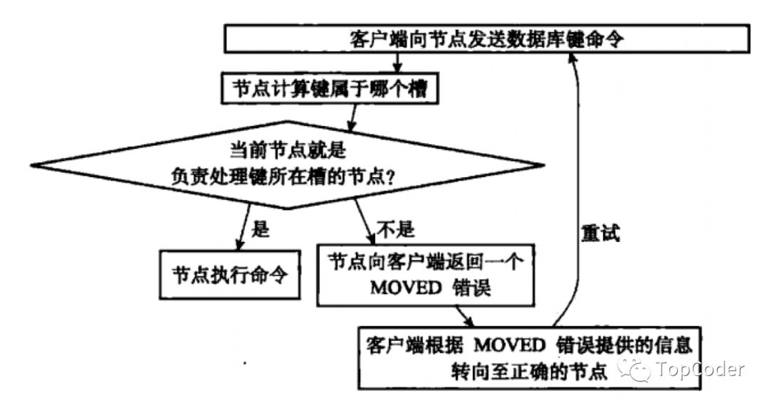 在对数据库中16384个节点都进行指派后,集群就可以开始工作了,当客户端向集群中节点发送命令时,会首先计算数据库键对应的槽(涉及到crc16函数),并检查clusterState.slots数组,来判断该槽位号是否指派给了自己,如果指派给了自己则直接执行命令,否则会向客户单返回一个MOVE错误命令,引导客户端转向到正确的节点继续执行该命令。MOVE错误命令中包含了正确节点的IP和PORT信息,格式为moved <slot> <ip>:<port>。节点和单机数据库一个重要的区别就是cluster节点只能使用0号数据库,而单机Redis服务器没有这个限制。节点除了将键值对保存在数据库里面之外,还会用clusterState结构中的slots_to_keys跳跃表来保存键和槽之间的关系。
