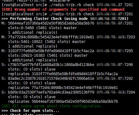 如果检测集群状态的话,随便check一个节点都会出来全部的信息,还能看到各自占用了什么槽,比如下面的0-5460.