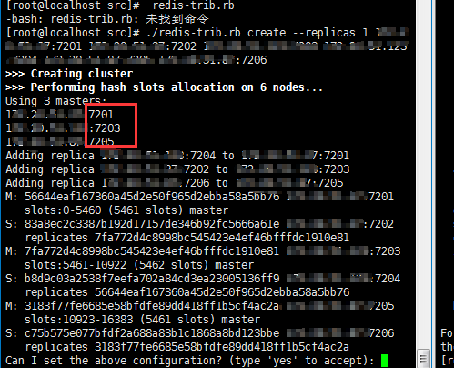./redis-trib.rb create --replicas 1 ip.37:7201 ip.37:7202 ip.123:7203 ip.123:7204 ip.87:7205 ip.87:7206