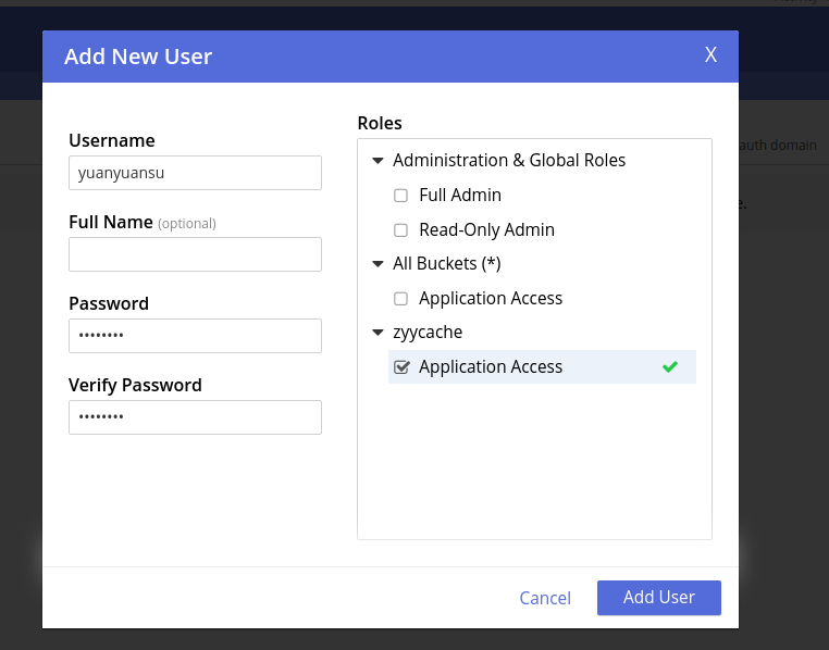 选择Security选项卡,去添加用户,我在这里只给了新建用户访问刚刚新建的zyycache桶