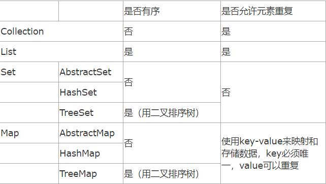 List 以特定次序来持有元素,可有重复元素。Set 无法拥有重复元素,内部排序。Map 保存key-value值,value可多值。
