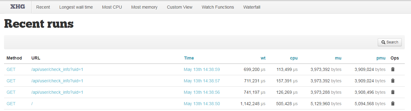 我们请求几次应用的接口,打开浏览器输入http://xhprof.test.com/,可以看到: