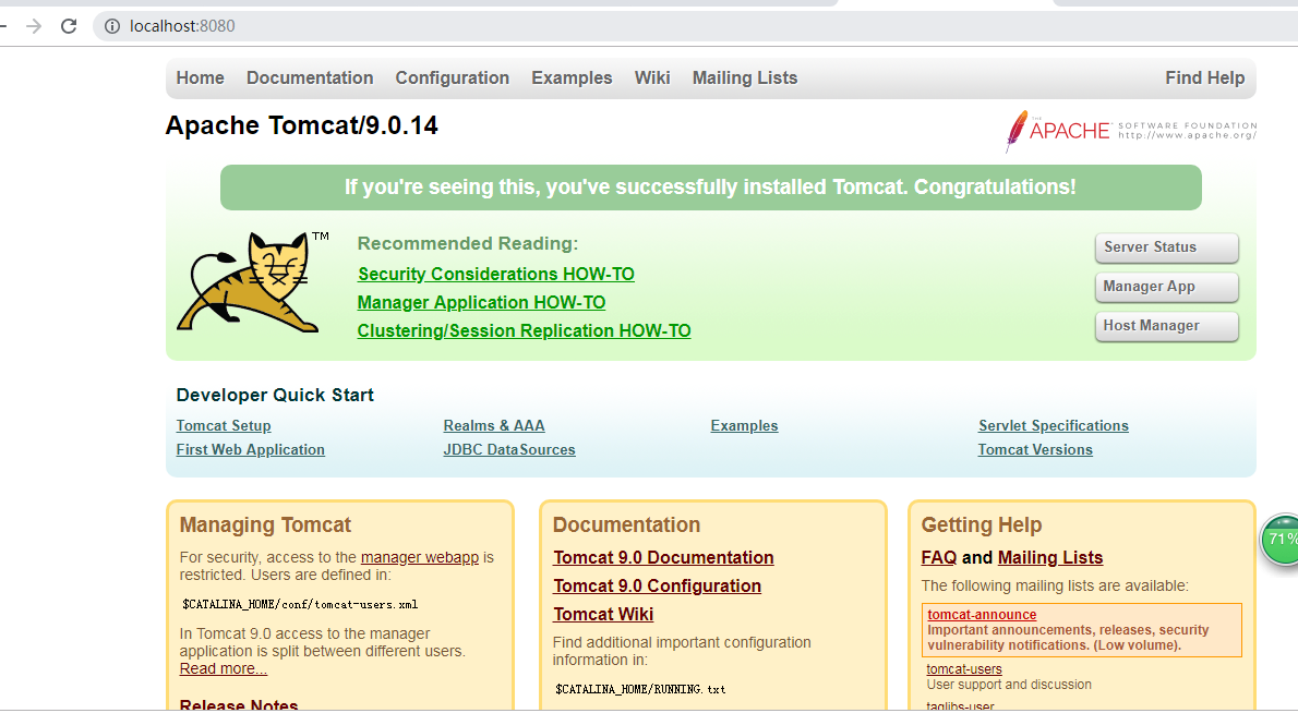 如果出现tomcat示例主页,则表示服务器安装成功,如图