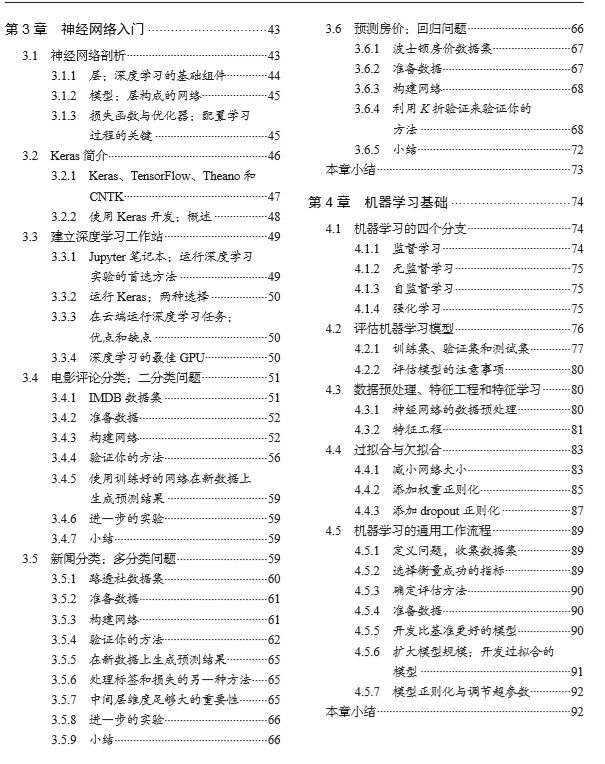 第3章包括上手神经网络所需要了解的全部内容:Keras 简介,它是我们的首选深度学习框架;建立自己的工作站的指南;三个基本代码示例以及详细解释。读完这一章,你将能够训练简单的神经网络来处理分类任务和回归任务,你还将充分了解训练过程背后 发生的事情。