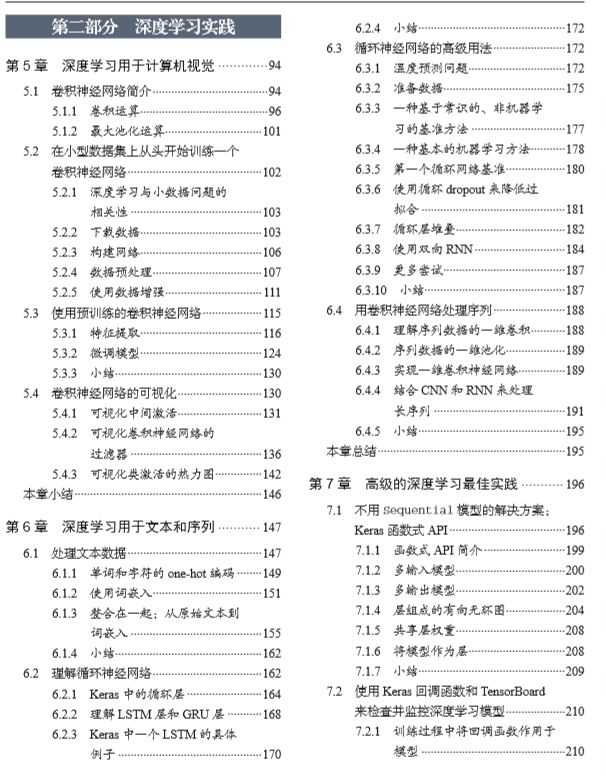 第4章介绍标准的机器学习工作流程。你还会了解常见的陷阱及其解决方案。第二部分将深入介绍深度学习在计算机视觉和自然语言处理中的实际应用。这一部分给出了许多示例,对于在现实世界的实践中遇到的深度学习问题,你可以用这些示例作为解决问题的模板。