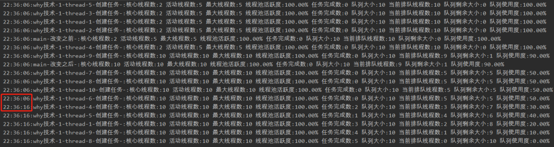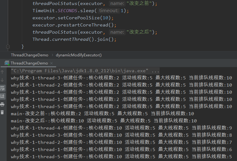 改变之前的核心线程数是 2,最大线程数为 5,我们动态修改核心线程数为 10。