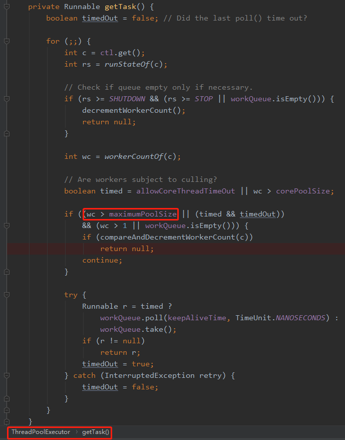 在这个方法中我们可以看到,如果工作线程数大于最大线程数,则对工作线程数量进行减一操作,然后返回 null。