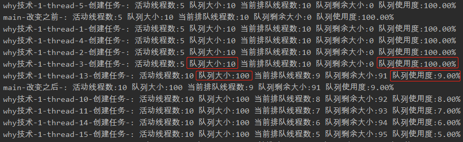 可以看到,队列大小确实从 10 变成了 100,队列使用度从 100% 降到了 9%。