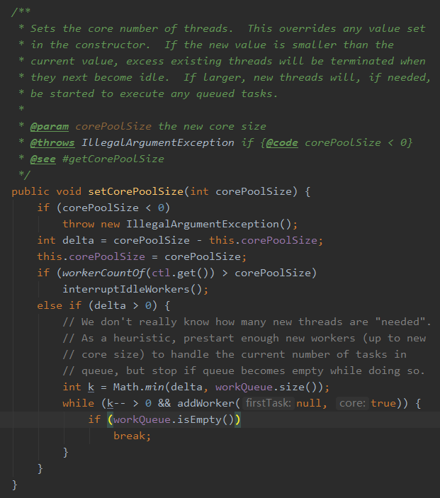 看了美团的那篇文章后,我又去看了 Spring 的 ThreadPoolTaskExecutor类 (就是对JDK ThreadPoolExecutor 的一层包装,可以理解为装饰者模式)的 setCorePoolSize 方法: