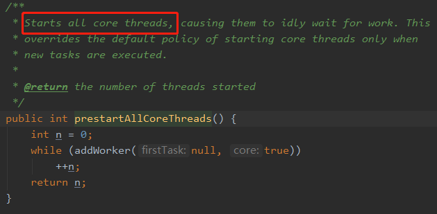 线程池被创建后如果没有任务过来,里面是不会有线程的。如果需要预热的话可以调用下面的两个方法:
