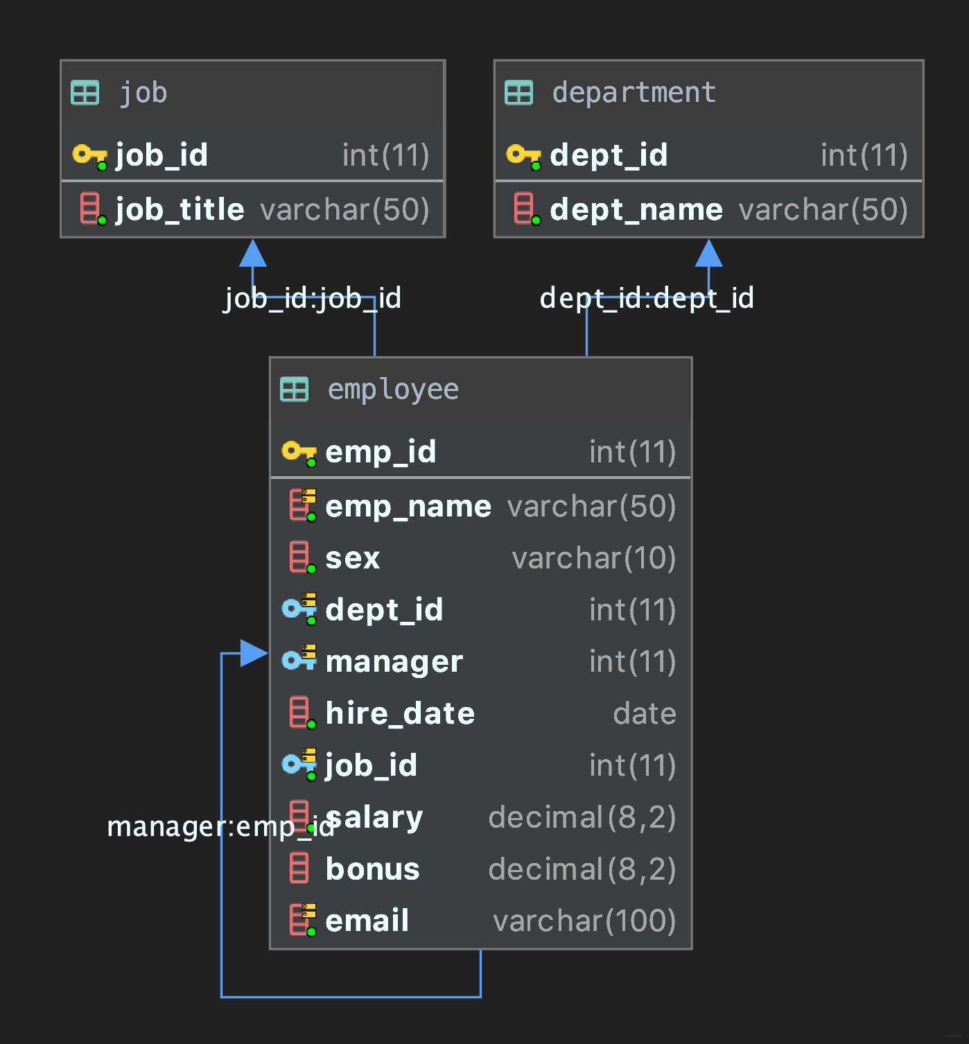 包含 3 个表:员工表(employee)、部门表(department)和职位表(job)。