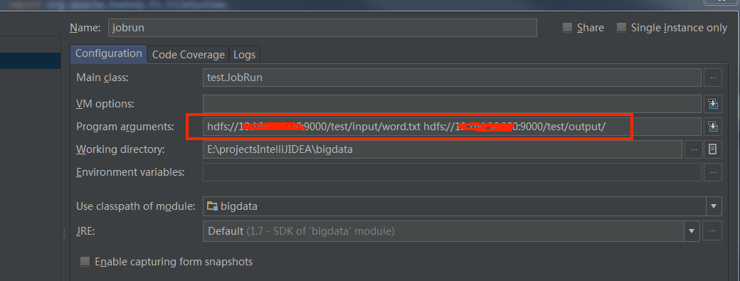JobRun.java运行时需要输入参数,hdfs计算输入和输出的路径,或者在run configurations中配置,如下图,注意路径的hdfs地址需要为core-site.xml中的地址