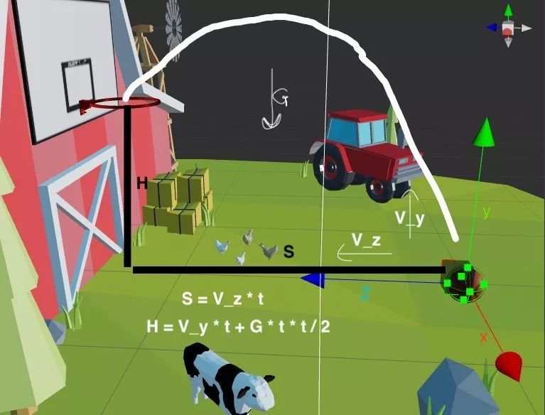 我们可以分为三个方向来考虑,需要计算初始速度 V_z 和 V_y 。在 Z 轴方向可以看作匀速运动,Y 轴方向为匀加速运动。其中 Z 轴 和 Y 轴 的位移我们已经设定好了,我们只需要设定抛球时间 t 就可以计算出初速度。注意 Y 轴的末速度要满足与初速度相反,才能达到图中抛物线的效果哦。参考计算方式如下:
