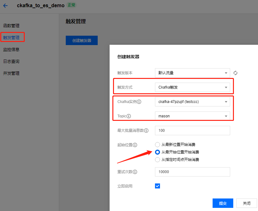 2. 创建 Ckafka 触发器