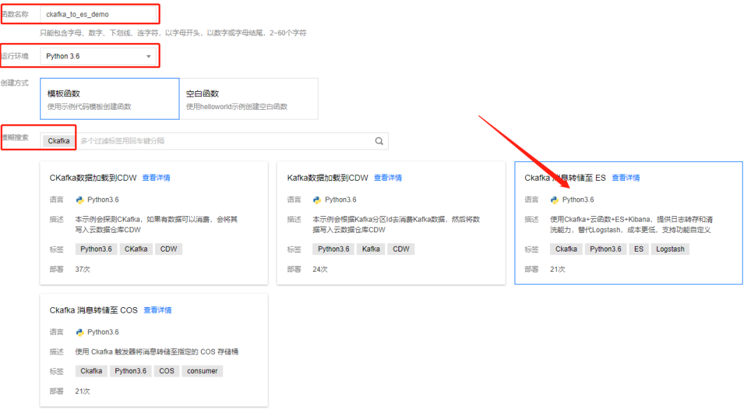 登录云函数控制台,选择地域后,新建函数,选择运行环境Python3.6,搜索“Ckafka”,选中模板函数后,下一步。