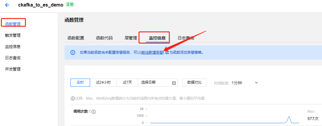 针对函数的运行状态,可以自行配置监控告警,实时感知业务运行情况。
