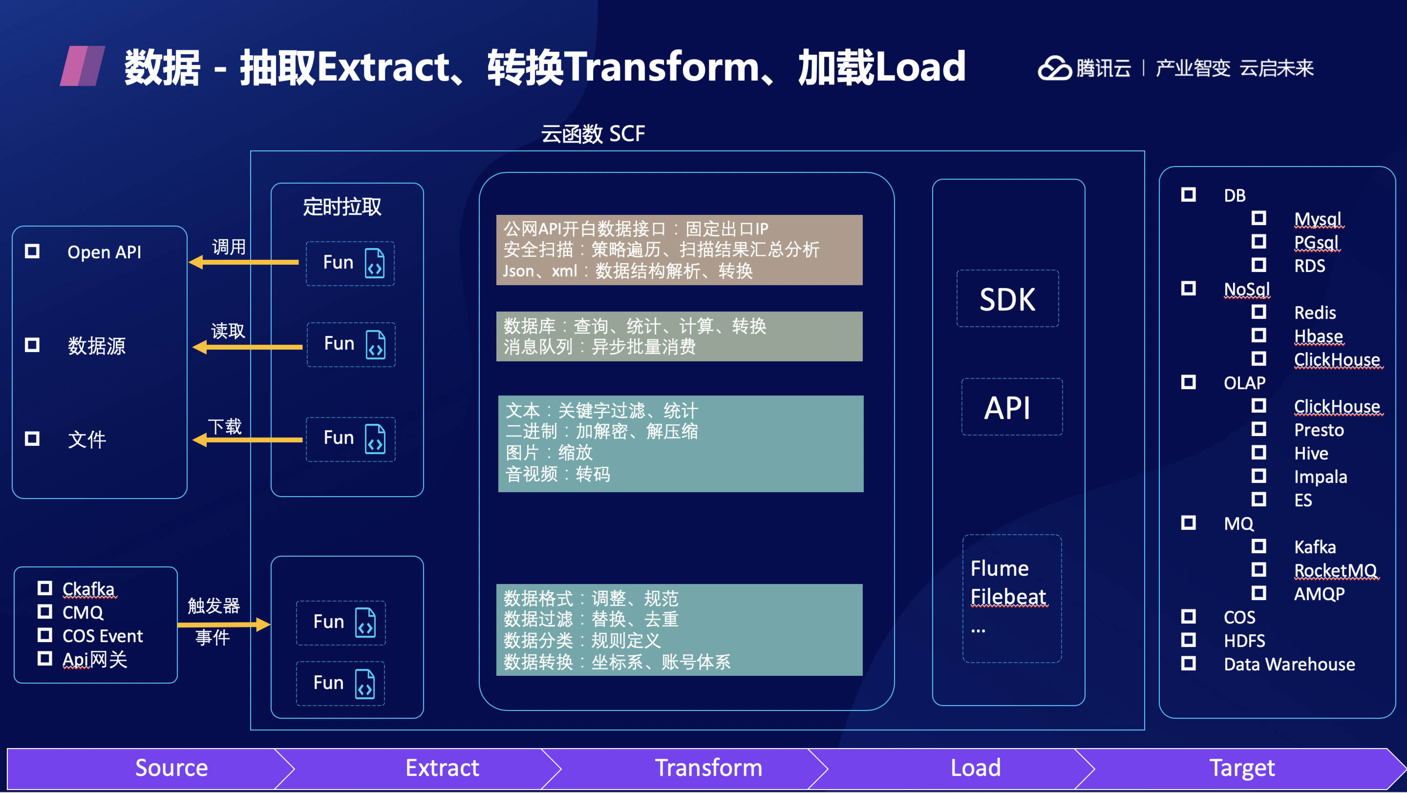 ETL 场景是指业务上需要做数据抽取(Extract)、数据转换(Transform)、数据加载(Load)的场景。腾讯云 Serverless 云函数在这方面有很大的优势: