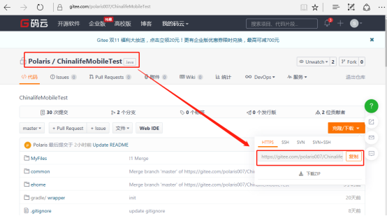 4、 克隆地址来源:码云如图所示地址;