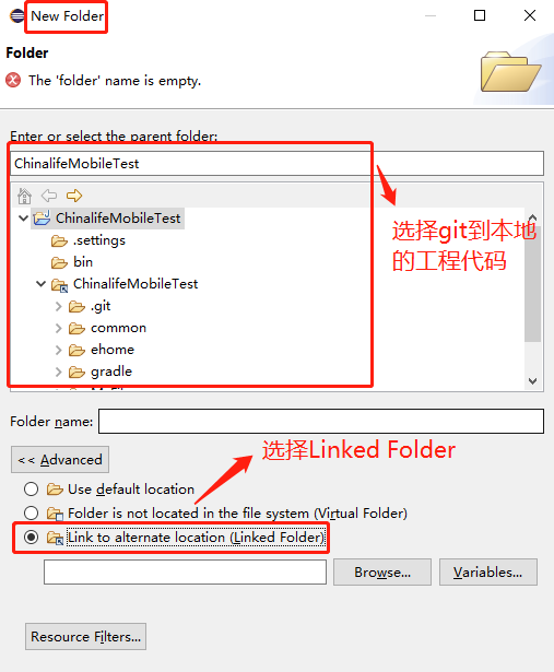 3、 点击“ChinalifeMobileTest”工程项目右键---》New---》Folder---》选择git到本地的工程代码---》选中“Link to alternate location(Linked Folder)”;