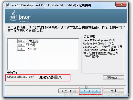 (2)、指定jdk安装目录 C:\Java\jdk1.8.0_144 然后点击“下一步”;