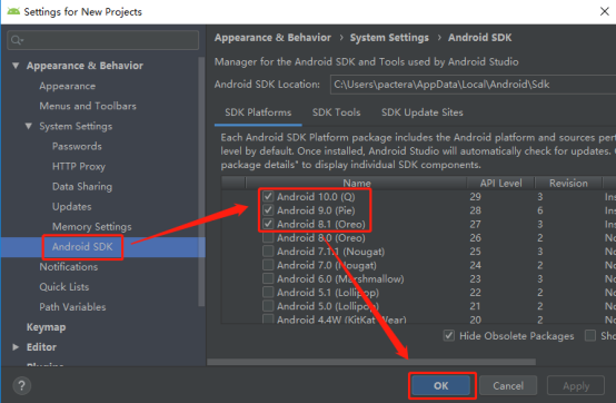 2、 在Setting for New Projects界面,选择测试手机的Andoid版本;