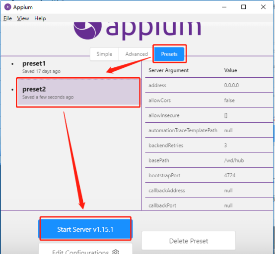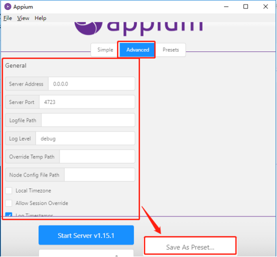 1、 首先打开 Appium 桌面版,进入Advanced页面,配置General,点击Save As Presets进行配置保存;