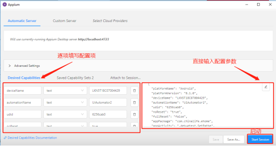 (1)、配置参数:{ "platformName": "Android", "platformVersion": "9", "deviceName": "LKN5T18C07004429", "automationName": "UiAutomator2", "udid": "LKN5T18C07004429", "noReset": "true", "fullReset": "false", "appPackage": "com.chinalife.ehome", "appActivity": ".debugtest.SetPathe" }
