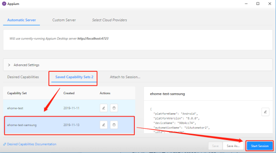 5、 保存后,可以点击 [Saved Capability Sets]选择对应 App 的配置,直接进行定位;