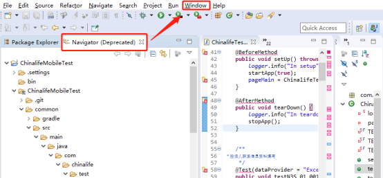 4、 展示Navigator(Deprecated):点击菜单Window---》选择Show View菜单项---》选择other菜单项---》在type filter text文本框中直接打na…就可以搜索出来---》选择“Navigator(Deprecated)”;