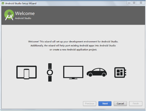 6、 点击cancel,然后进入到了AS的安装向导界面;