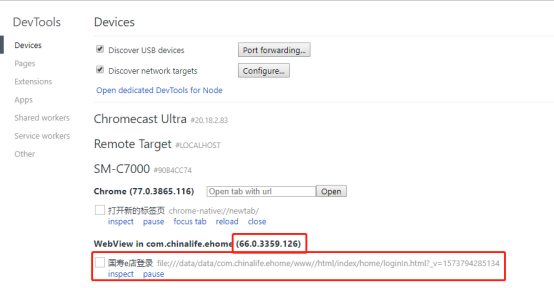 1、 打开手机测试应用(“国寿e店”)---》修改正确IP---》进入测试应用---》电脑上打开Chrome浏览器---》在地址栏输入【chrome://inspect/#devices】---》查看到手机对应的webView版本(被测应用的webView版本);