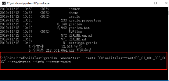 5、 使用gradlew执行用例:CMD---》输入命令【e:】---》输入命令【cd ChinalifeMobileTest】---》输入命令【gradlew :ehome:test --tests "ChinalifeTest*testN3S_01_001_003_0003" --stacktrace --info --rerun-tasks】