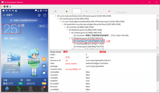 (1)、左边部分为当前设备屏幕截图,可以直接点击你想查看的元素;