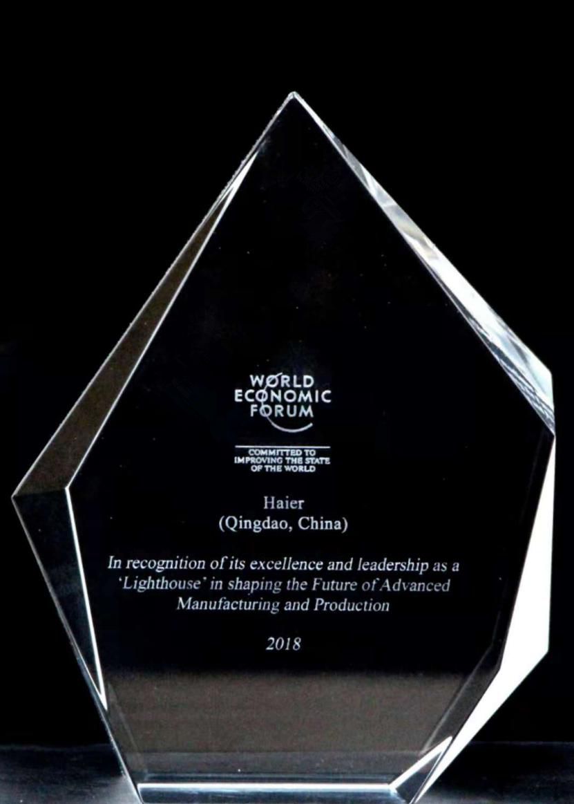 (图1:海尔获评世界经济论坛全球首批“灯塔工厂”的奖杯:“海尔以卓越的表现和领导力成为灯塔并塑造先进制造和生产的未来”)