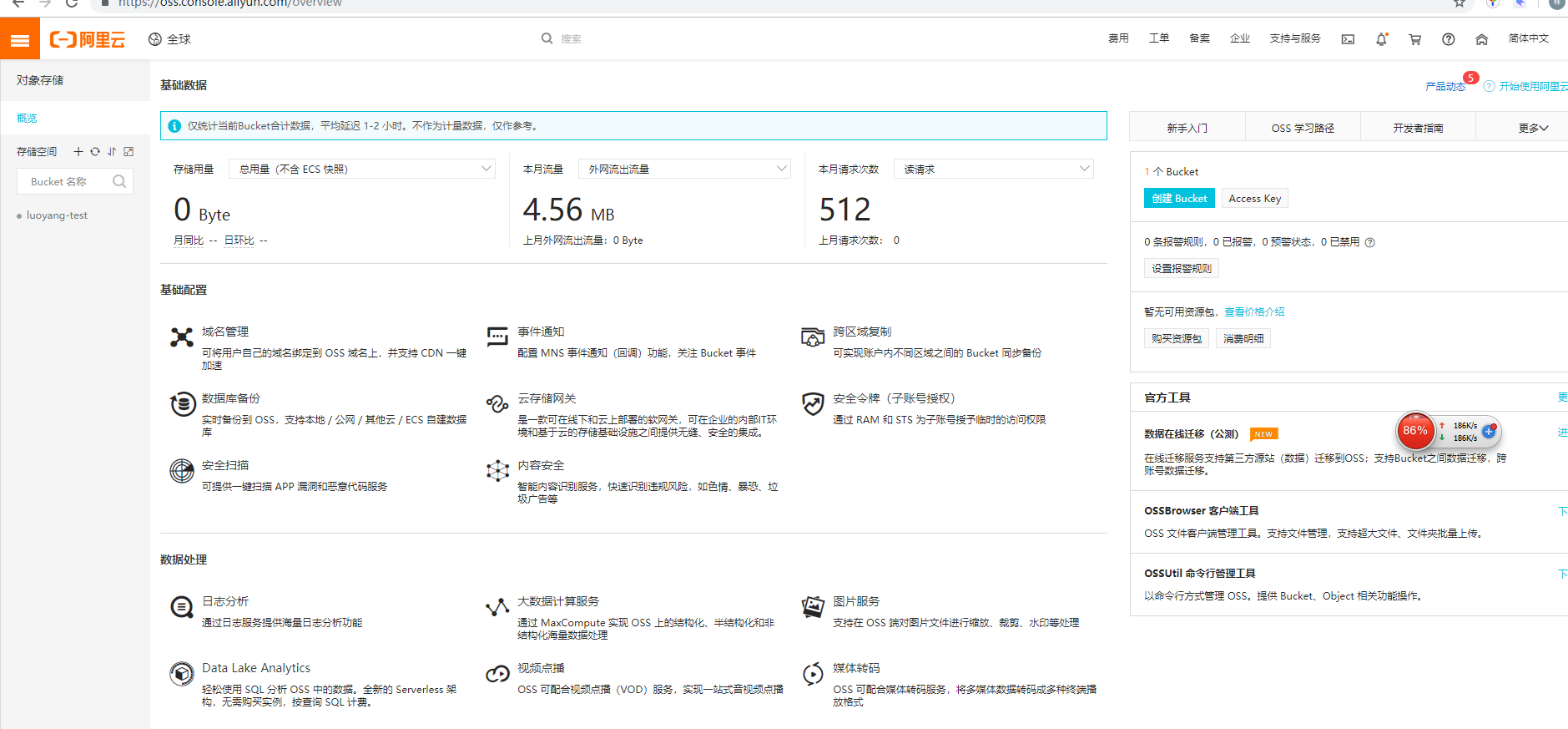 首次使用,应该是要确定授权开启对象存储oos的,确定之后,会生产accesskeyid和accesssecret,记得保存下来,后面使用都需要这两个值