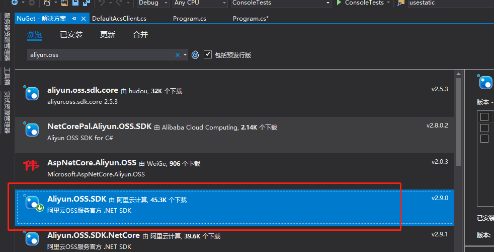创建控制台程序,然后添加nuget包如图,下面直接看代码