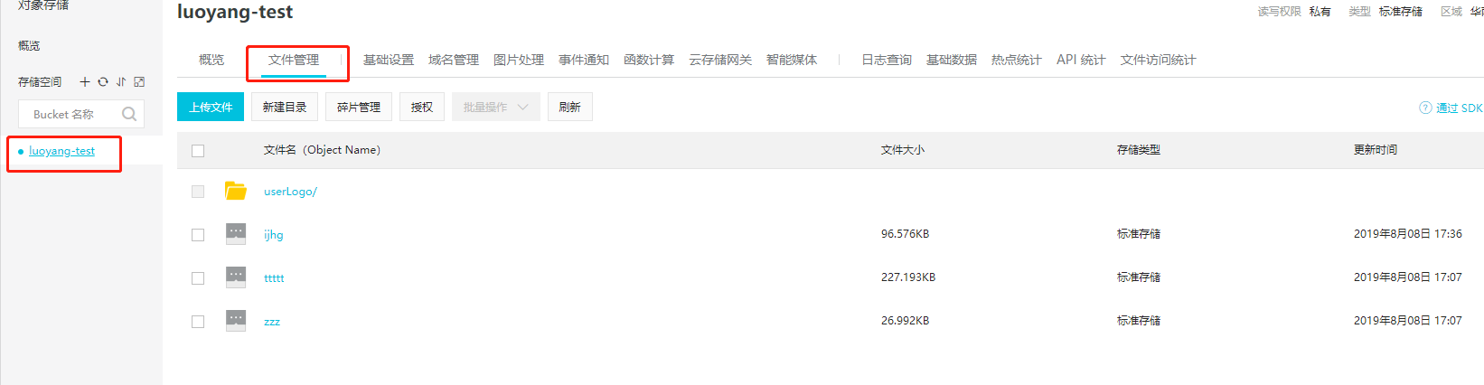 上传成功后,去阿里云上看一看,点击自己的bucket,然后选择文件管理,发现已经有上传好的文件了。