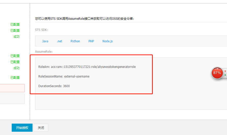 输入手机验证码后获得如图,这个roleArn后面STS服务程序上面要用到
