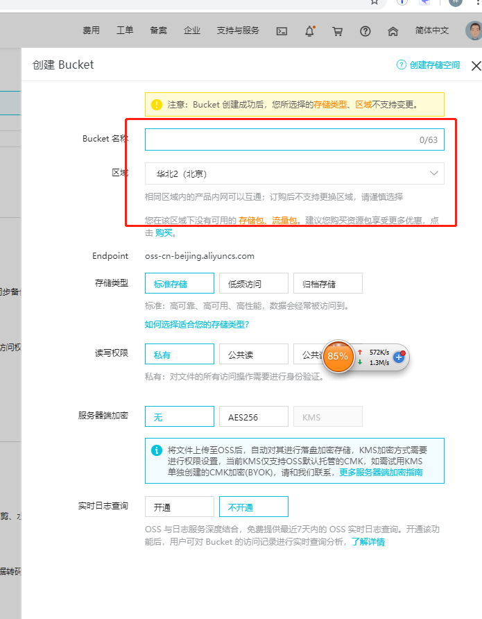 下一步,创建自己的bucket,阿里云的bucket就是一个空间的总称,可以理解成一个磁盘,如图