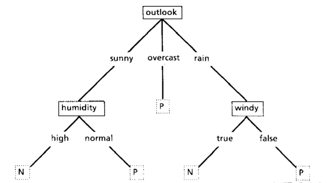 可以发现 Outlook 的信息增益最大,优先在这个特征上划分,在递归到其他特征上最终形成的决策树图如下: