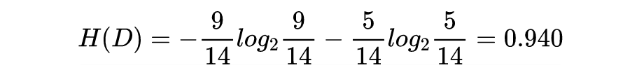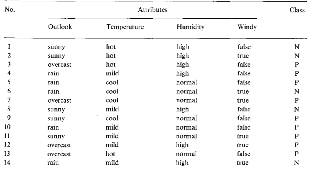 假设有两个分类,一个是 N,一个是 P,Outlook 表示天气情况,Temperature 表示气温情况,Humidity 表示湿度,Windy 表示有风,这四个作为特征,每个特征下面的离散值作为特征值。那么数据的熵 :