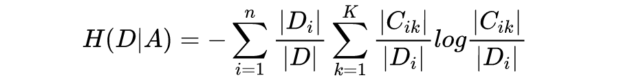 2)选择用样本的某一个特征 A 来划分样本集合 D 时,就可以得出特征 A 对样本 D 划分所带来的信息增益。特征 A 把 D 划分为 n 个子集,计算特征 A 对数据集 D 的条件熵 H(D|A):