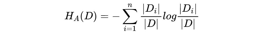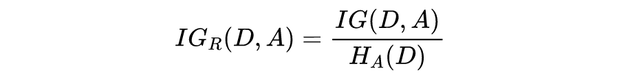 特征 A 对训练数据集合D的信息增益比 定义为特征 A 的信息增益 IG(D,A) 与训练数据集 D 关于特征 A 的取值熵 之比,即: