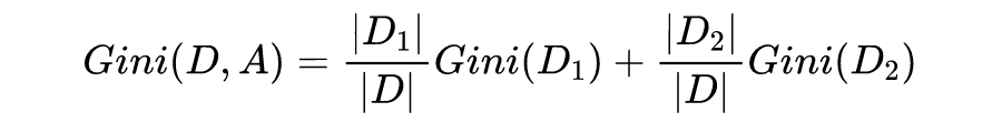 在特征A下,将数据划分成两类,一类是 ,一类是 ,那么在特征 A 下的基尼系数为: